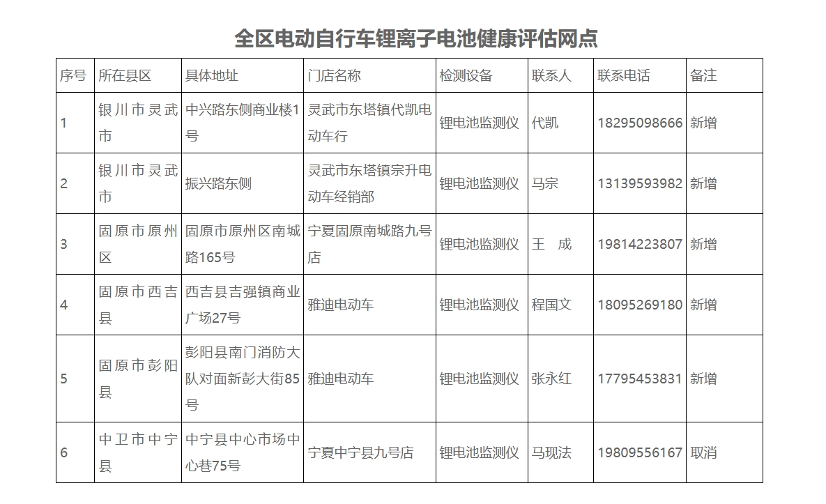 按照2025年9月19日初步确定并公告的全区电动自行车锂离子电池健康评估网点、回收网点及回收企业名单,结合各网点近期开展工作实际和便民高效原则,经与市级工信部门充分沟通确认,对全区26家锂离子电池健康评估网点、34家回收网点及8家回收企业进行优化。新增全区电动自行车锂离子电池健康评估网点5家,减少1家;新增全区电动自行车锂离子电池回收网点3家、减少1家;新增全区电动自行车锂离子电池回收企业1家,现予以公告。