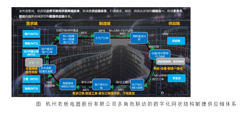 面对供应链冗长且错综复杂带来的信息流通不畅、决策效率较低,供需信息的不对称性带来的市场反应迟缓,交付延迟与产能过剩问题并存导致的库存积压现象严重等情形,杭州老板电器股份有限公司打造直达用户数字一体化供应链系统,推动供应链上下游企业高效协同。一是推动全国一盘货与库存一盘棋。建立全国性的库存中心,实现库存的统一管理和调配。通过WMS系统实时监控库存状态,并利用大数据分析预测销售趋势,合理分配库存资源,减少冗余库存。打破线上线下、不同渠道间的库存壁垒,实现库存信息的共享和统一调配。二是推动订单驱动生产。建立以用户需求为导向的生产计划体系,通过ERP和MES系统,实现订单的快速响应和精准排产。通过SRM系统实现供应链上下游的信息共享和协同作业,确保原材料和零部件的及时供应,减少因缺货导致的生产延误。三是实现增产不增库。引入精益生产理念,通过流程优化、工艺改进等手段,提高生产效率,降低生产成本。四是利用云计算和AI技术,对生产数据进行实时分析,预测市场趋势,灵活调整产能规模。通过转型,杭州老板电器股份有限公司促进了供应链各环节的深度协同,前端直达用户通过供应链直配改革,减少中间环节,提高了交付效率与准确性;中端通过订单拉动、精准供应与敏捷制造,确保了订单的快速交付与高质量完成;后端则通过深度协同,持续优化成本结构,提升整体竞争力。2023年引领了27家上下游企业踏上数字化转型之路,参与转型的企业在内部成本上节省了375万元,不良率下降56%,信息化覆盖率提升至90%。