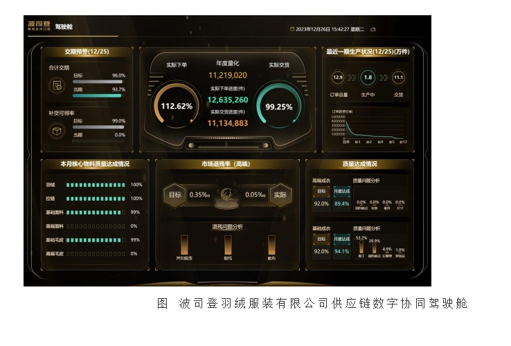 羽绒服制衣行业季节性特征显著,业务链路较长,研发、生产、零售等活动交杂,导致企业普遍面临库存积压、原材料供应成本波动等问题。为解决企业供应链上下游协同管理难度大、协作成本较高以及信息传递不畅等问题,波司登建立了链接上下游高度集成的供应链管理协同平台,把ERP、MES、WMS、POS等系统连接起来,运用供方管理平台、采购线上化、协同平台、智能排单、产销协同等数字模块,形成供应链上下游全面协同管理体系。一是应用数字化三维设计、3D打版,以终端消费数据驱动产品研发,实现人体数据采集、虚拟试衣、样板和工艺的自动生成、柔性加工生产。二是通过供方在线化管理平台实现供方生产进度、产能、车台等核心数据在线共享、智能分析决策。三是通过原辅材料集采统购平台实现一体化、全品类、集约化采购管控。四是通过优质快反一体化平台建成敏捷供应链体系,精准预测市场预期、优化产业链资源配置、合理排产、齐套到料、在线协同,降低供应商、制造商库存。波司登大数据平台接入企业用户2556家,实现与供应商、加工厂的深度协同,推动快反周期从21天减少到12天,产品不良品率从7.9%下降至2.26%,综合能耗单位产品能耗下降45.92%。