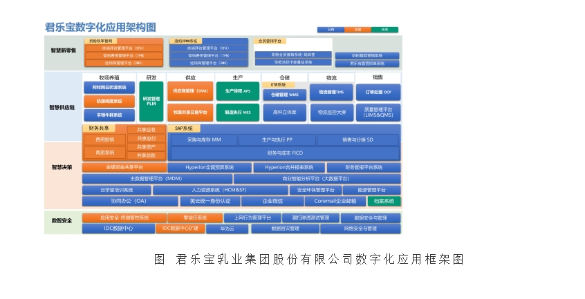 面对乳制品需求变动、销量波动频繁,产品保鲜要求高、供产销协同复杂、物流网络庞大、营销场景多样化以及运营效率低、成本高等问题,君乐宝乳业集团股份有限公司打造乳制品全产业链数字化服务平台,通过建设种植、养殖、加工、仓储、物流、销售等全产业链系统,服务牧草种植、奶牛养殖、原辅料和包装材料、乳制品加工、经销商、物流、电商等上下游企业,促进数据资源整合,完善乳业生态体系。一是打造智慧供应链。打通牧草交易、奶源管理、产销协同、仓储物流,整合生产、仓储、物流、销售、财务等环节数据及资源,赋能上下游企业良性经营。二是推动实现智慧新零售。打造渠道管理和会员管理系统,重点为产业链上的数千家经销商提供业务管理工具,同时实现对全产业链200余万家门店和亿万消费者的连接,推动全场景覆盖,优化组织间的系统协同。三是推动智慧决策。开发共享交易平台、流程管控平台和大数据分析平台,赋能上下游中小企业智慧经营决策,助力乳业生态圈跨越式增长。通过乳制品全产业链数字化服务平台,君乐宝已服务牧场及上游企业138家、经销商4000家、供应商450家、物流商40家,打造了行业共赢生态圈。