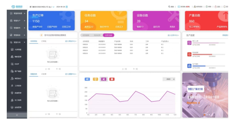 厦门鑫铭科技股份有限公司原有信息化系统无法满足各业务部门间的信息共享管理需要,形成了信息孤岛,进而导致企业业务流程受阻,各部门协同工作效率偏低等问题。由于数据未能有效集成,企业难以获取全面、实时的业务数据,影响管理层决策。为解决信息共享与数据集成问题,鑫铭公司引进了工厂“ERP+MES”解决方案,实现企业全过程数据集成与共享。一是打通ERP与MES,将企业业务管理过程、生产执行过程、财务核算过程、决策支持过程引入到系统中进行集成管理,实现基础信息、基础数据、业务单据、管理报表等在同一业务平台的调用。二是企业ERP业务单据完成后自动下推至MES中进行生产执行管理,MES系统执行过程的结果数据自动存储至系统中,实现了MES与ERP系统数据的统一存储和管理,构建数据仓库。三是企业ERP与MES单据只需一次录入即可完成业务流程的串联,形成完整的闭环管理,过程数据及时更新数据报表。经过系统上线后的不断优化提升,公司订单交期达成率提升20%;业务协同效率提升至95%;物料出入库防呆防错达99%;生产效率提升25%。