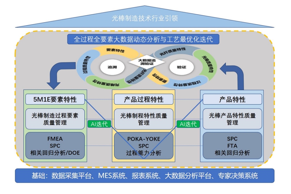 光纤预制棒是光纤光缆产业技术含量最高、流程最复杂、过程控制精度最高的领域,存在生产要素过多、工序流程复杂、产品质量稳定性难以保证等问题。为解决光纤预制棒生产质量管理问题,武汉烽火锐拓科技有限公司一是建立了数字化工业大数据平台,并基于平台成熟应用,设计了三循环迭代质量管理模式,即大数据追溯和验证的外部“8”字循环迭代、风险分析和实验设计验证的最优化设计循环迭代、过程能力和AI自我学习的内部“V”型循环迭代。二是通过对生产全过程全要素的大数据进行动态分析和工艺最优化迭代,追溯和验证影响光纤预制棒质量的生产要素,得到最优工艺参数组合包,针对工艺参数设计风险模型和实验进行分析验证,依次优化制造过程要素特性、产品过程特性和产品质量特性,并借助AI大数据模型对工艺参数进行优化和动态匹配。经过不断优化提升,公司光纤预制棒综合成品率提升至98.5%,制造成本降低30%以上,制造工艺技术和产品质量均达到国际先进水平。