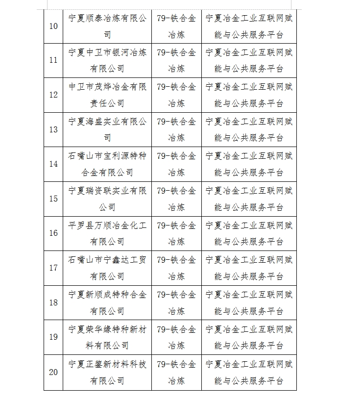宁夏铁合金冶炼行业中小企业数字化转型试点企业名单
